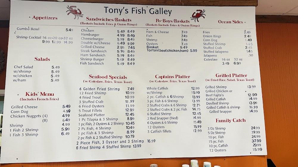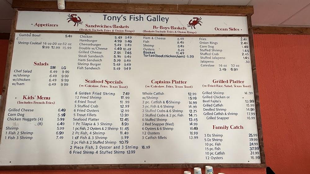 Tony's Fish Galley features a diverse menu filled with seafood delights and comfort food. From crispy fried shrimp and catfish to homemade tortillas and tacos, each dish highlights fresh flavors. Popular items include the captain's platter, with combinations like whole catfish paired with succulent shrimp. Vegetarian options, kids' meals, and daily specials ensure everyone finds something to love.