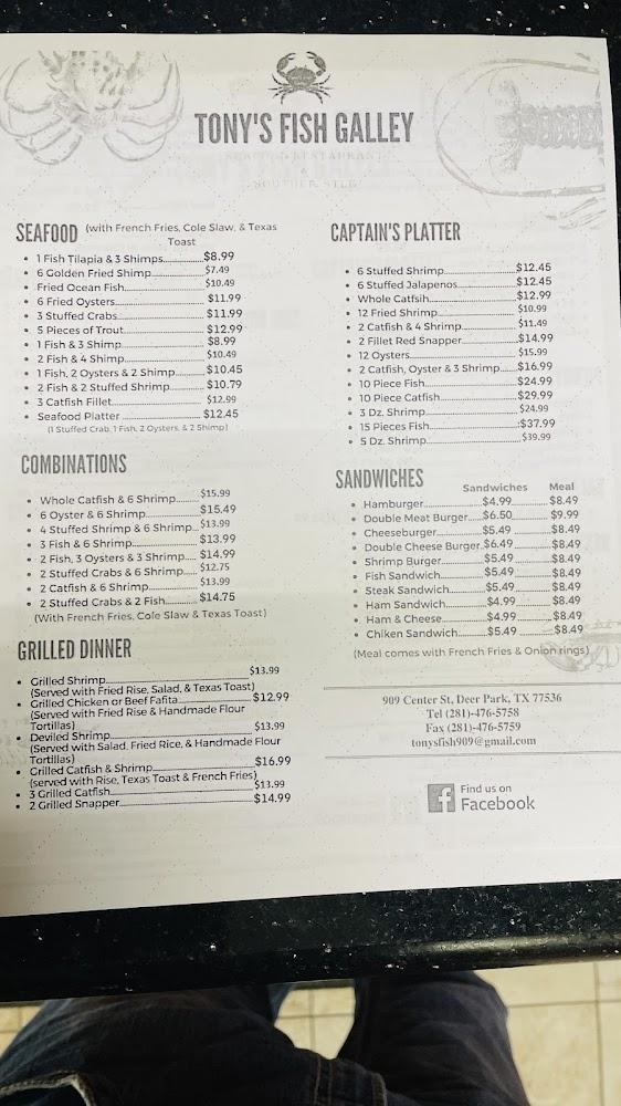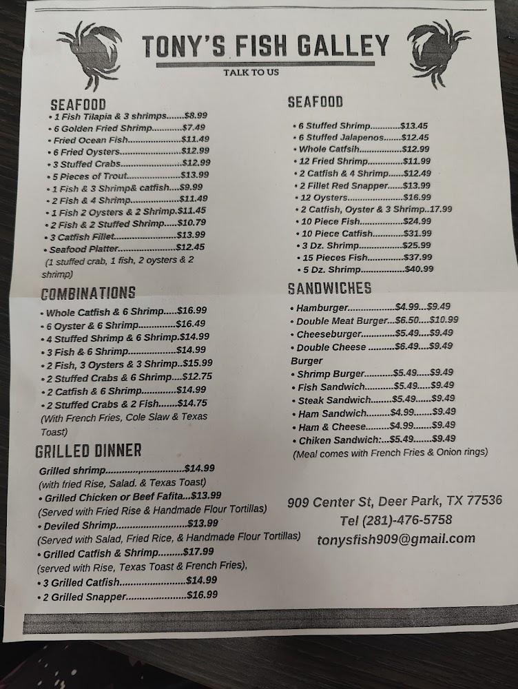 Welcome to Tony's Fish Galley, your go-to seafood haven in Deer Park, TX! Located at 909 Center St, we offer a delightful menu filled with local specialties, perfect for breakfast, lunch, or dinner. Enjoy a relaxed atmosphere with accessible seating options and a variety of dining services, including dine-in, takeout, and delivery. Our affordable prices range from $10 to $20, making it easy to treat yourself or your family. With kid-friendly options and a commitment to quality, Tony’s Fish Galley is ideal for solo dining or gathering with groups. Come savor the taste of fresh seafood and warm hospitality!